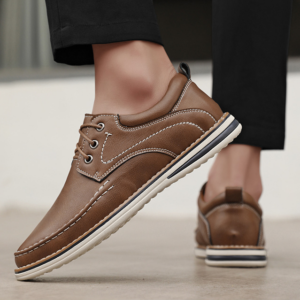 Designed to be your comfiest everyday shoes, these moc-toe lace-ups are crafted from smooth grain leather with padded collars and soft lining for long-wear comfort. Raised toe seams and contrast topstitching highlight the silhouette, while the sneaker-style sole keeps every step light and steady.