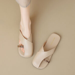 Step into a world of elegance and comfort with these chic slides, adorned with a unique buckle that elevates any look. The soft leather insole and sculpted foot contour ensure every step feels as good as it looks.