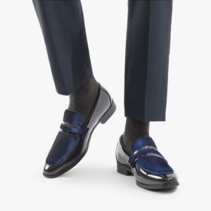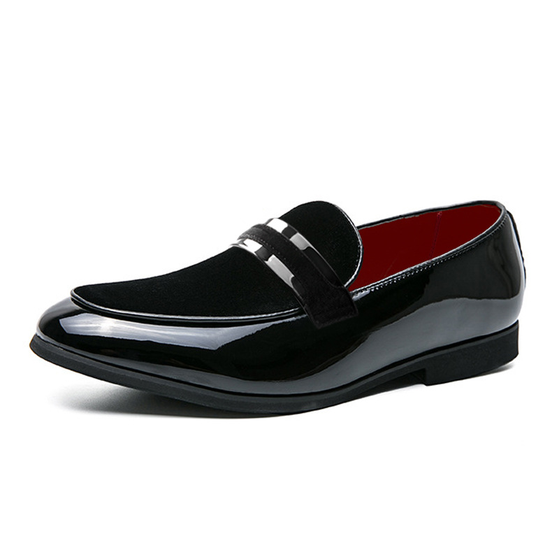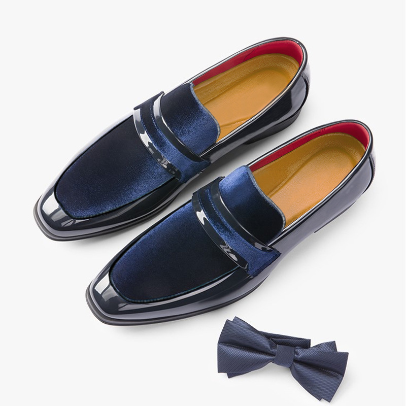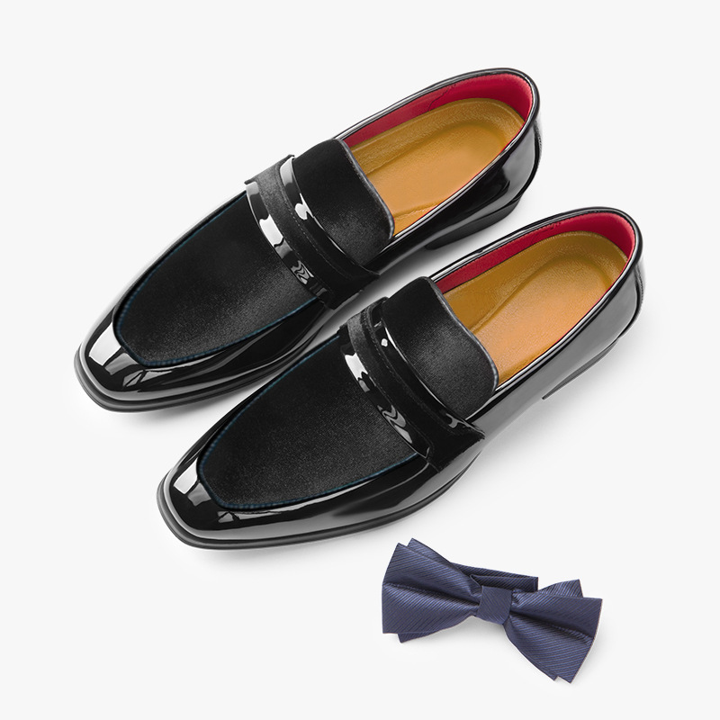 These sleek dress loafers combine glossy patent leather with rich velvet for a modern take on classic formal footwear. The contrasting textures create a striking look while the low-profile design makes it perfect for special events.