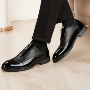 Crafted with genuine ostrich leather and set against sleek patent panels, these shoes bring bold detail to a refined silhouette. A hidden side zip adds smooth closure, while the cushioned sole provides unmatched comfort.
