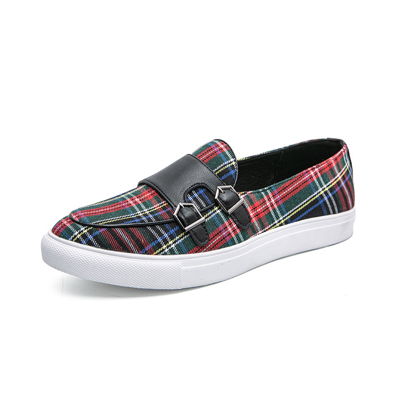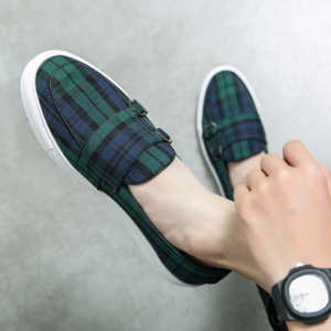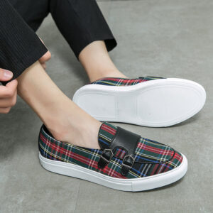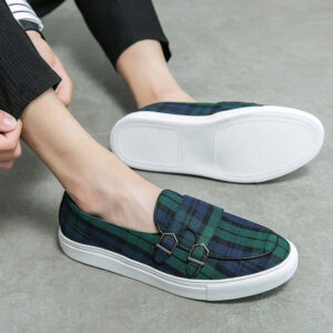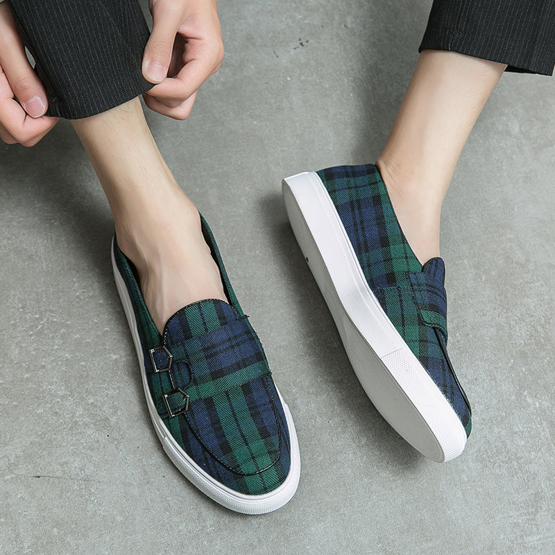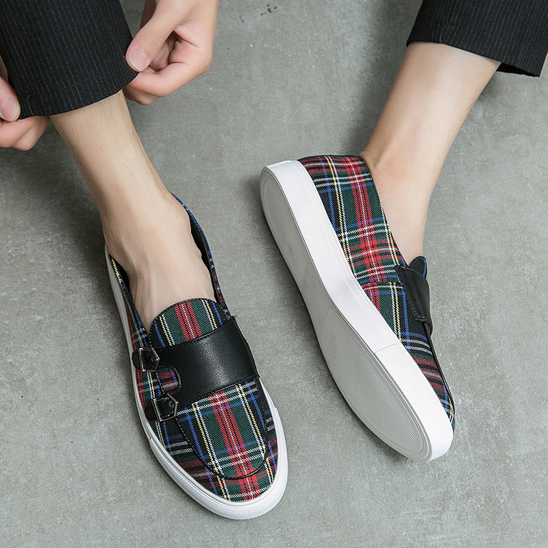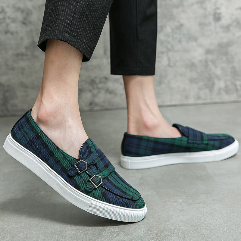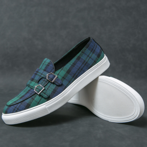Crafted from premium woven cotton with a bold tartan weave, these loafers bring a polished edge to casual wear. Dual metal buckles and a smooth leather saddle create standout contrast over a flexible rubber sole built for all-day comfort.